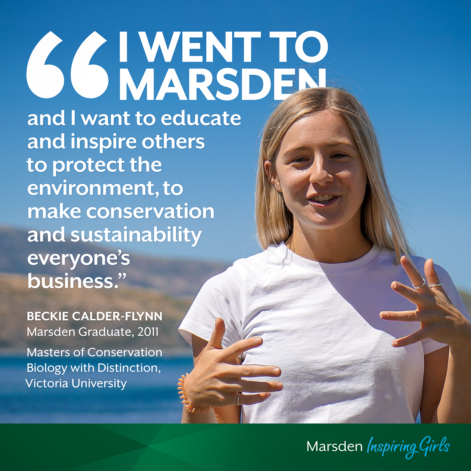 Beckie graduated from Marsden in 2011 and was Head of Upper School in her senior year. She loves biology and credits her early interest to "the amazing Mrs Gunn for putting so much passion, enthusiasm, and baby animal pictures into her classes." She gained a Bachelors of Science from Auckland University then left New Zealand to travel to Africa and complete a life-long dream of working with wildlife rehabilitation and conservation organisations. From hand-rearing baby monkeys to hunting poachers, tracking hyenas to giving lions health checks, Beckie attributes her time in Africa for "changing her life and outlook on the world."